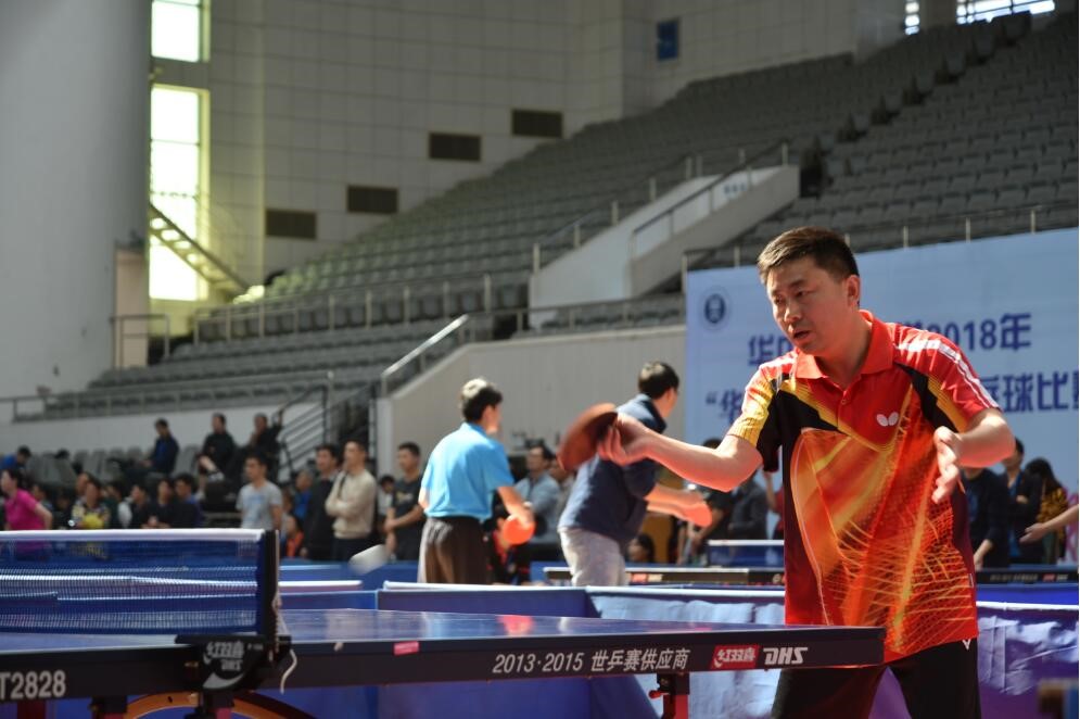 首轮上场的是张业茂老师和郭志东老师组成的男子双打,两人相互配合,打出了很多精彩的接球,随后董和平老师参加了男子单打的比赛。在后来的女子单打比赛中我方代表徐晴与对方的比赛也异常激烈,来回的挥拍交替。
