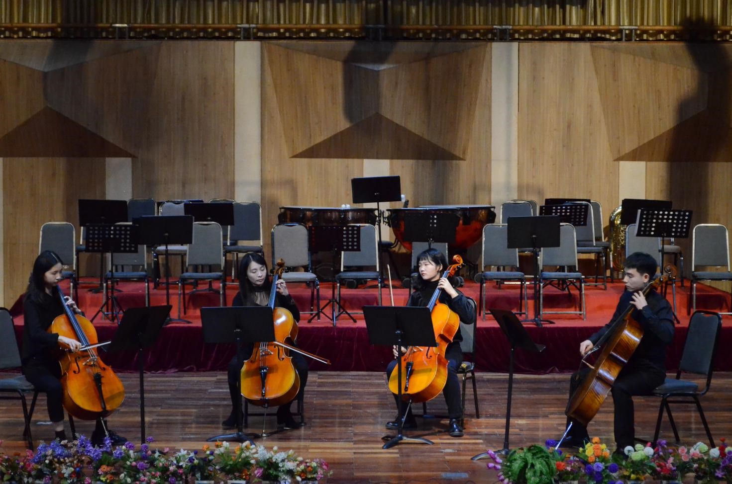 11月15日晚,音乐节开幕式音乐会在音乐厅上演。 一曲优美动听的大提琴四重奏《茉莉花》引得观众掌声、欢呼声连片。据悉本次大提琴四重奏团由音乐学院器乐系大提琴教师康乔瑄与学生冯望、刘婉、冯小庭共同组建。经过一周多时间的密集排练与练习,在此次音乐会上带来了精彩的演绎。