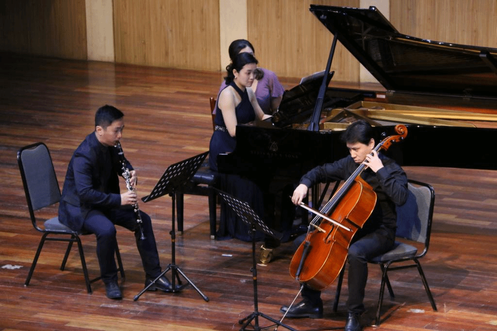 第一首由首都师范大学硕士研究生导师王英男(单簧管)、大提琴讲师徐沛、钢琴系副教授孙晓雪带来的《单簧管、大提琴、铜琴三重奏op.114》是勃拉姆斯晚期作品代表作之一。这部作采用A调单簧管演奏,予以更好的体现作品中忧郁深邃的意境。共四个乐章,第一乐章的主题动机在各段落中的延伸、衍变与发展,以及节拍重音的转换与声部间交错的手法,都造成了勃拉姆斯音乐所特有的紧张、忧伤和内在的动力。