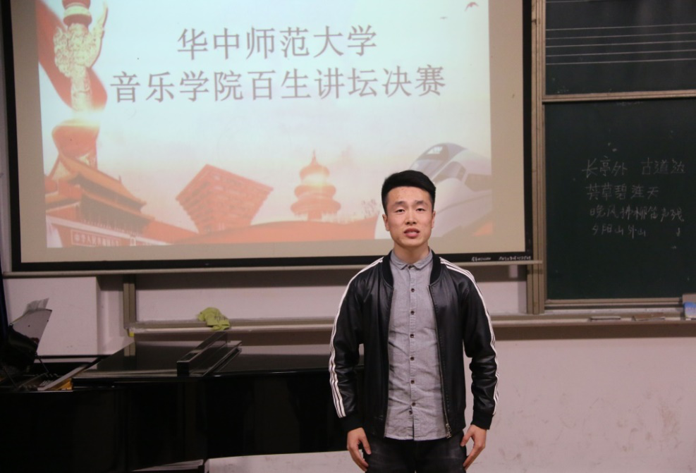 夏巾帧同学的演讲不同于其他同学的是,增加了PPT观赏模式,并在演讲开始前播放了一首《游击战歌》,调动了整场气氛,所有人都兴致勃勃的等待演讲的开始。演讲的主人公是贺绿汀,他是一个用音乐做武器的人民音乐家,夏巾帧同学运用巧妙的语言使其革命精神和爱国情怀感动了在场的每一个人。