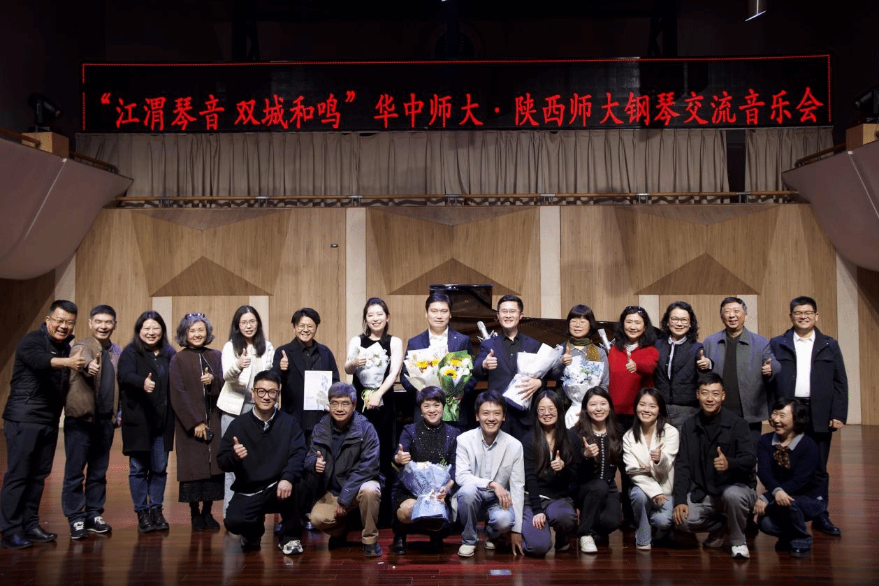3 月 27 日,由华中师范大学音乐学院主办、音乐表演系钢琴教研室承办的“江渭琴音,双城和鸣”华中师大与陕西师大钢琴交流音乐会在音乐厅温情奏响。两校钢琴名师以琴键为媒、以旋律为语,联袂献上一场兼具民族气韵、艺术深度与原创力量的音乐盛宴,让长江文脉与三秦风骨在悠扬乐声中相遇碰撞。