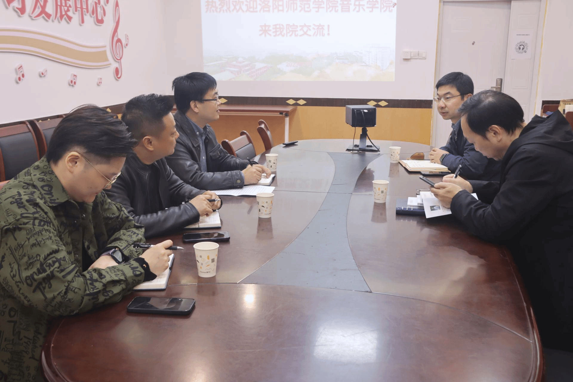 3月7日下午,洛阳师范学院音乐学院王建朝副院长一行来我院交流学习。学院党委副书记陈晓刚、副院长张业茂接待了王建朝副院长一行,双方在学院316会议室召开了交流会。