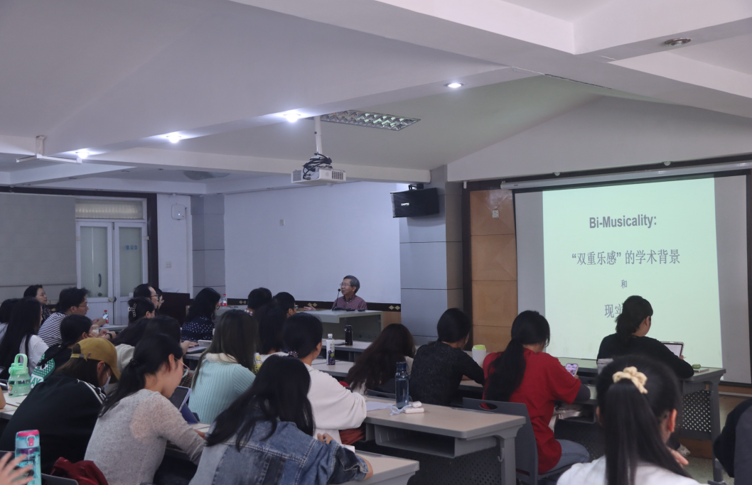 周晋民教授向我院师生分享了自己在美国马里兰大学攻读博士学位的学习经历,介绍了自己的博士生导师——著名音乐学家曼特尔·胡德教授,并由《The Challenge of Multiple Musicality》这篇文章引出“双乐能”的概念。在文章的翻译过程中,周教授将“Musicality”一词译为“乐感”,通过不断深入研究,认为“乐能”一词比“乐感”更加具有概括性。他还介绍了部分中西学者在此领域的研究成果并给予了肯定,为我院学生的学术研究提供了新视角。