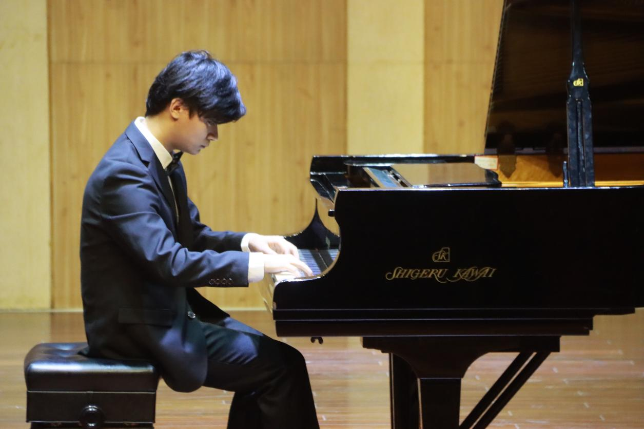 首先为大家带来的是由2021级本科生韩文灏同学演奏的《刘天华即兴曲三首》。该作品是我国老一辈作曲家崔世光先生于1998年创作完成的钢琴套曲,以二十世纪初中国著名作曲家,演奏家,教育家刘天华的三首二胡曲《空山鸟语》,《良宵》,《光明行》作为主题素材,吸收借鉴了原曲旋律的精华之处,借助钢琴音域宽,表现形式多样的优势进行的改编再创作,是东方民族音乐韵味与西方作曲技法结合的又一典范。韩文灏同学的指尖犹如蜂鸟的喙一般,将那悠远山谷中的“鸟语”带到了我们的面前。