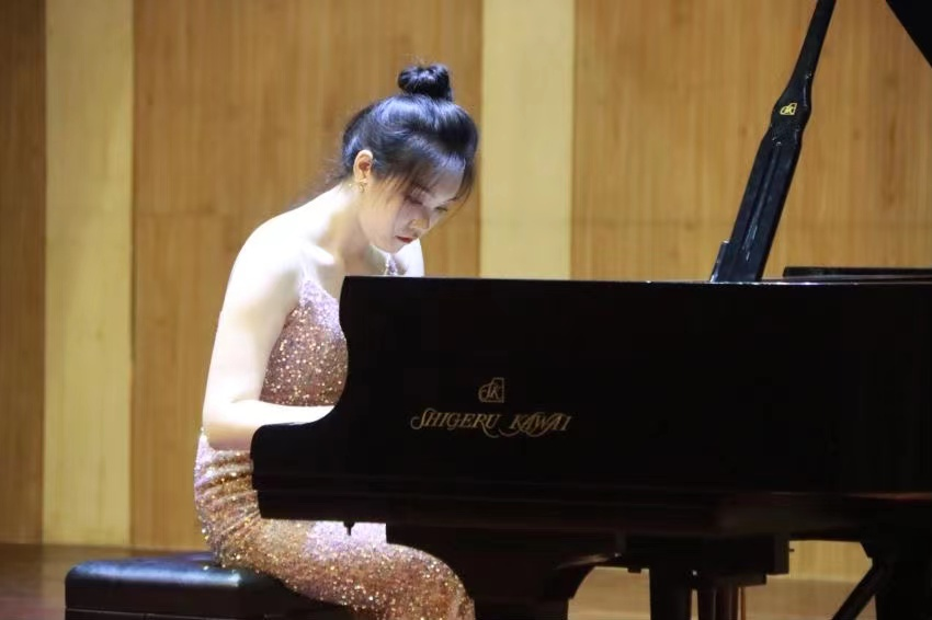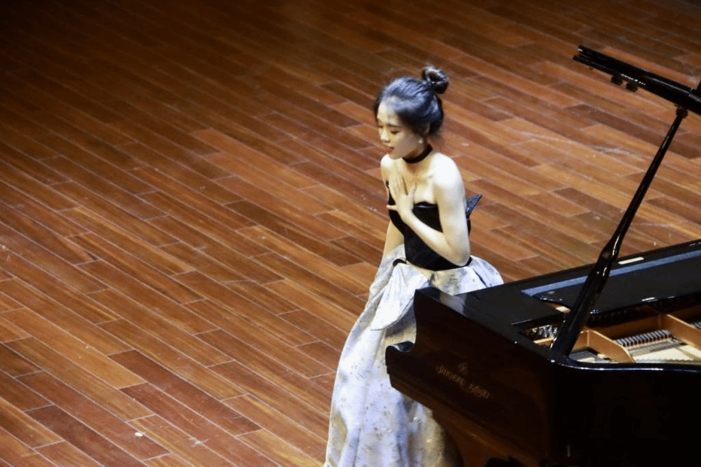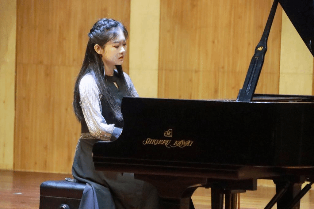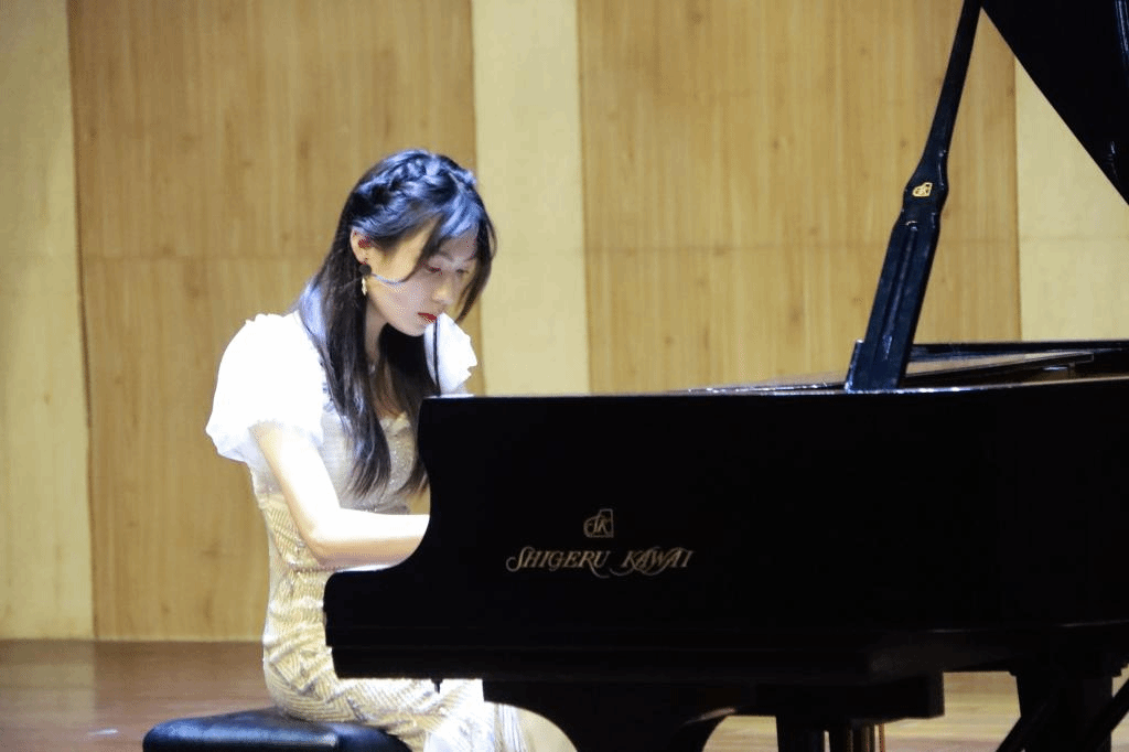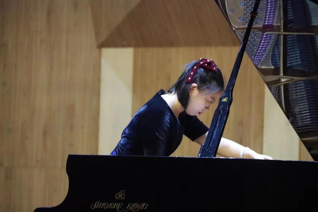 而后,是由2019级本科生张丹婷同学带来的《雅之声——琴韵》。该作品是我国朝鲜族作曲家、中国音乐学院作曲系教授权吉浩先生于2011年创作的一首极具革新意义的钢琴作品,其最大特点在于不直接引用任何民间原始旋律, 而是以模仿古琴的抹音、延音、滑音、古筝的刮奏和戏曲打击乐器小京锣奇妙的滑音为蓝本, 在钢琴上体现并加以叙述和展开。张丹婷同学精彩的演奏为我们勾勒出一副具有民族特色的交响器乐图,带来了一场独具中国传统“雅韵”意味的听觉盛宴。