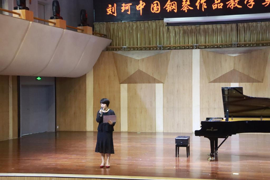 音乐会开场,刘珂老师走至音乐厅舞台中心,首先对到场的各位老师和同学们表示热烈欢迎和深深地感谢。其后,她对本场音乐会的总体构思进行了阐明。她讲到:”本场音乐会以中国现代钢琴作品为主题,着重精选了1998-2012年间我国老、中、青三代作曲家的经典名作,并将其按照两条主线加以排序。一是创作技法由最初更多沿用西方传统创作技法,发展到中西创作技法的融合,再到自身独特技法的开创;二是音乐语言由最初更多运用传统的“民族性”旋律语言发展到大量运用现代“个性化”的音响语言。本场音乐会的七首现代钢琴作品被分为两个板块:第一板块包括《刘天华即兴曲三首》《音诗》《雅之声——琴韵》三首作品,更突显传统民族韵味,第二板块包括《纳木错》《秋山鸣》《随想曲——乡情》《钢琴钟》四首作品,更彰显现代个性特色。在音乐的可接受性和可听性上则由易到难,逐步过渡。最后,她分别对两个板块的作品进行了详细分析和讲解,表演者也按照两个板块先后登台演奏。