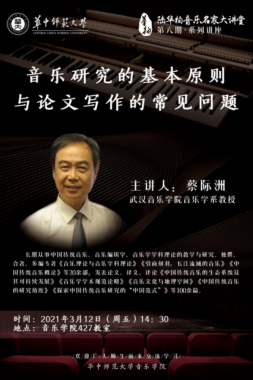 (摄影:许曾;综述:曹筱勤黄饶慧子)2021.3.12下午2:30,“陆华柏音乐名家大讲堂”(第六期·系列讲座)于华中师范大学音乐学院427大教室成功举办。主讲人蔡际洲教授,武汉音乐学院音乐学系教授,长期从事中国传统音乐、音乐编辑学、音乐学学科理论的教学与研究。在治学上,既借鉴西方民族音乐学和其他学科的理论与方法,又注重立足于中国音乐研究的历史文化传统;既追求对音乐本体的多角度微观透视,也讲究对音乐文化内涵和文化背景的解读与阐释。主讲专题《音乐研究的基本原则与论文写作的常见问题》。参与此次讲座的有我院所有研究生导师,以及部分研究生同学们。讲座开始由康瑞军院长对蔡教授进行了简短介绍,并代表华师音乐学院向蔡教授的到来表示热烈欢迎。