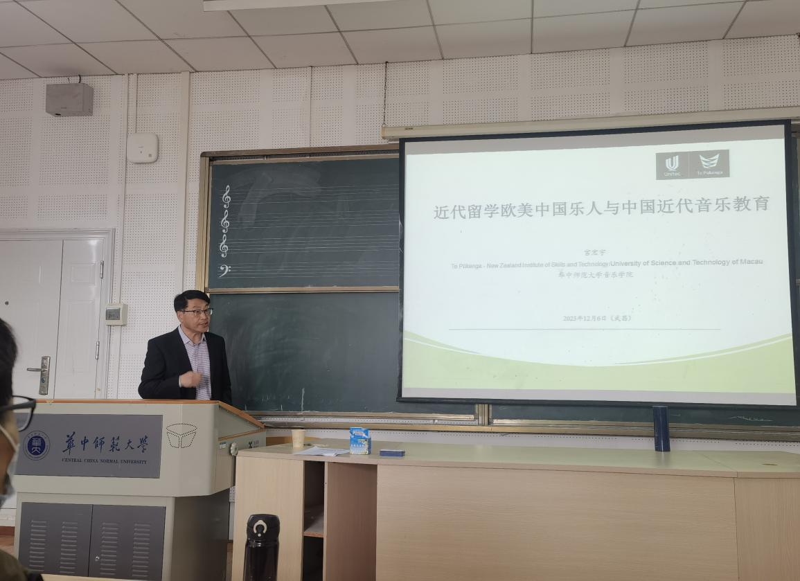 2023年12月6日上午10点,新西兰国立尤尼坦理工学院教授、哲学博士宫宏宇应邀出席华中师范大学音乐学院“海外名师音乐学术系列讲座”,以《近代留学欧美中国乐人与中国近代音乐教育》为主题进行学术讲座。讲座由我院音乐研究所所长陈永教授出席参加,我院部分研究生和本科生到现场聆听学习。