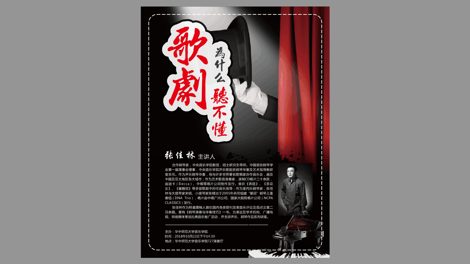 (综述:陈铭 摄影:汪振鑫 胡艺璇)2018年10月22日下午14:30,《歌剧为什么听不懂》专题讲座于华中师范大学音乐学院323会议室顺利举办。本次讲座主讲人为合作钢琴家,中央音乐学院教授,硕士研究生导师,中国音协钢琴学会第一届理事会理事,中央音乐学院声乐歌剧系钢琴伴奏及艺术指导教研室主任张佳林教授。讲座由钱勇副教授主持,我院声乐系教师和音乐学师生代表参与了此次讲座,整个会议室座无虚席。