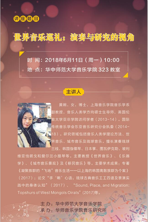 (通讯员:孙震林)2018年6月11日上午10:00,上海音乐学院音乐学系黄婉副教授于华中师范大学音乐学院323会议室举办了题目为“世界音乐巡礼:演奏与研究的视角”的讲座。本次讲座由康瑞军副院长主持。我院钢琴系、音乐学系部分师生参与了此次讲座,整个会议室座无虚席。