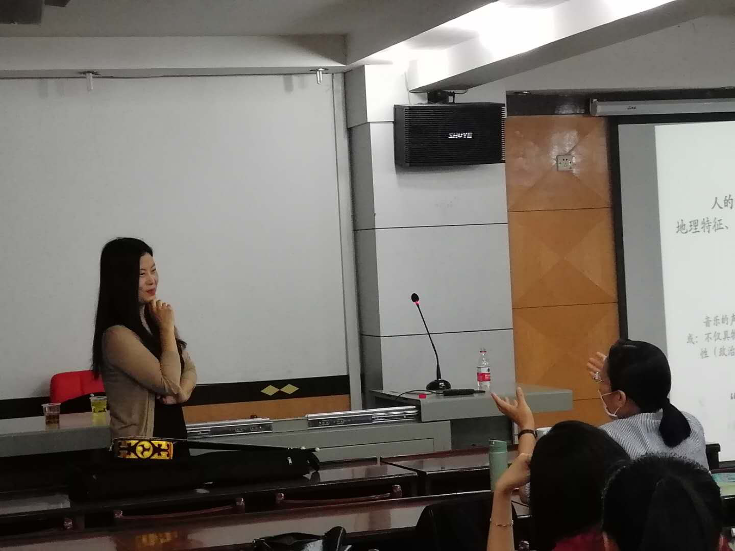 之后,黄婉副教授从“如何研究世界音乐?”的角度,结合之前所讲的文化差异问题,为大家具体讲解如何从文化内部,来尝试解读和理解世界各地、各民族音乐。她借用谢勒梅的观念,提出一个“多重景致”的解读框架,即在仪式中、游戏中、自然中、认同中去理解各地、各民族的音乐特征。