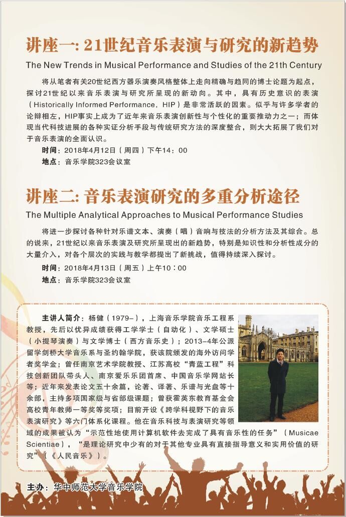 上海音乐学院音乐工程系杨健教授,将于2018年4月12-13日前来我院举行两场讲座。题目分别是: