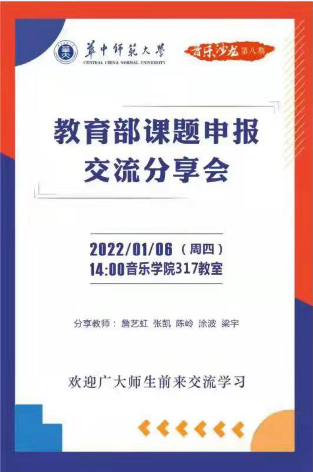 1月6日下午14点,音乐沙龙“教育部课题申报交流分享会”(第八期系列讲座)于华中师范大学音乐学院317教室成功举办。学院副院长詹艺虹教授,钢琴系张凯教授、涂波副教授,声乐系陈岭教授,舞蹈系梁宇副教授进行了教育部课题申报相关内容的分享。参加此次讲座的有我院青年教师,以及部分研究生同学们。