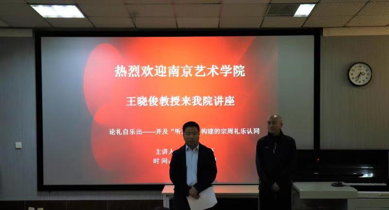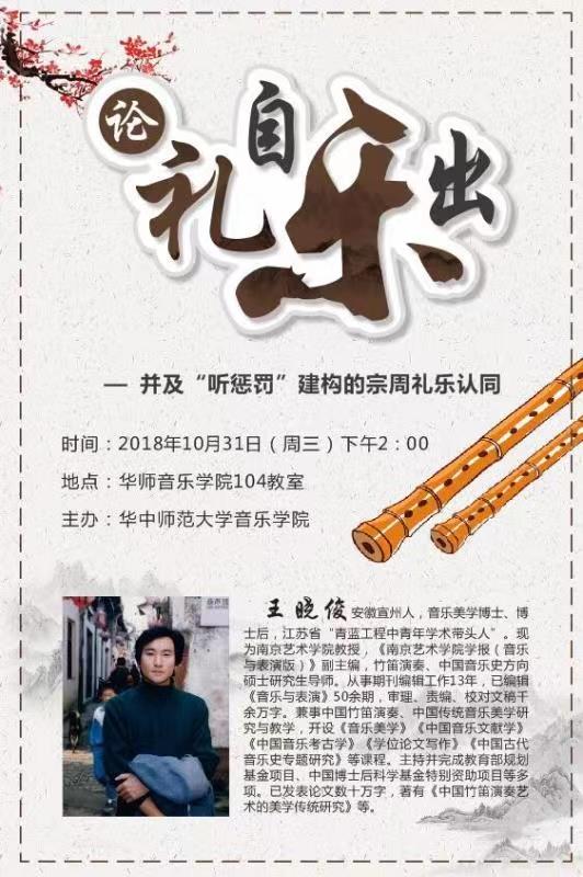 2018年10月31日14:00,《论“礼”自“乐”出——并及“听惩罚”建构的宗周礼乐认同》专题讲座于华中师范大学音乐学院104教室顺利举行。本次讲座的主讲人为南京艺术学院教授王晓俊老师。王晓俊老师是竹笛演奏硕士,音乐美学博士、博士后,现为南京艺术学院教授、研究生处处长,全国中文核心期刊《南京艺术学院学报(音乐与表演版)》副主编,竹笛演奏、中国音乐史方向硕士研究生导师。