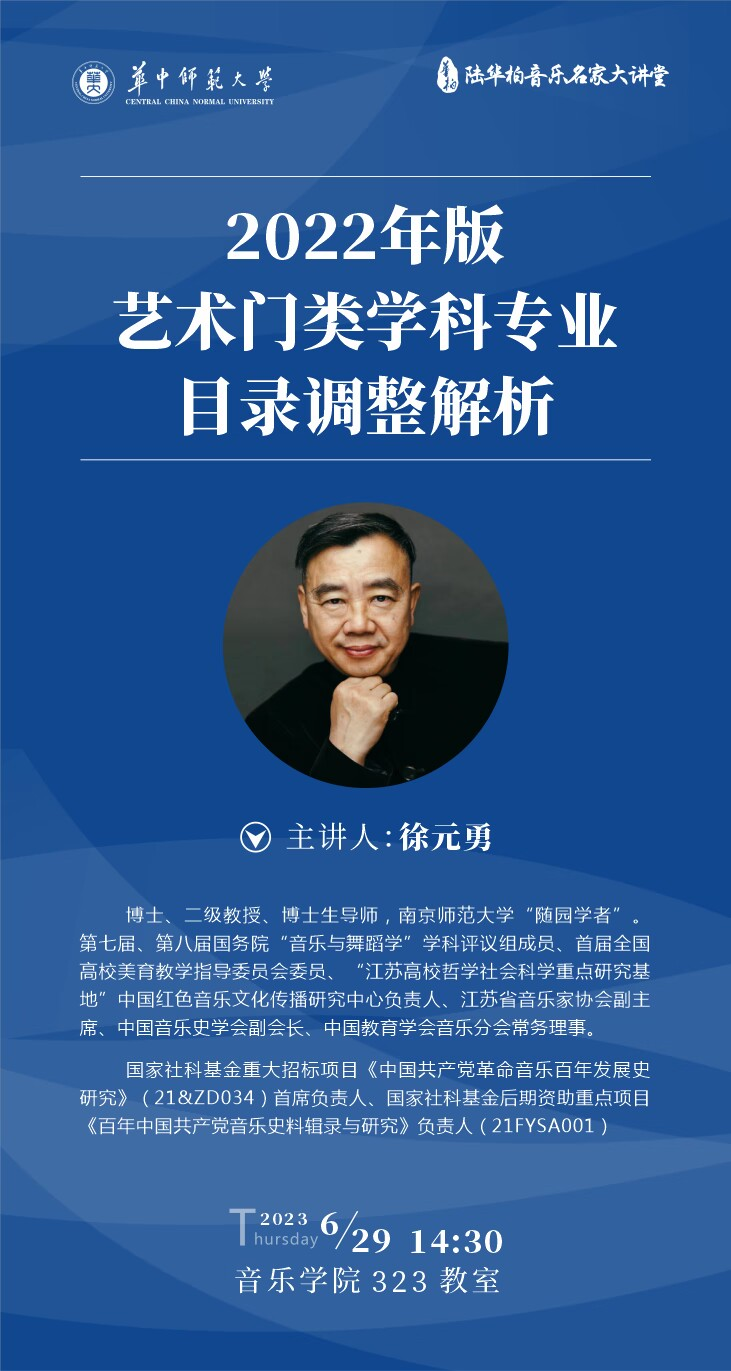 2023年6月29日下午14:30,华中师范大学音乐学院“陆华柏音乐名家大讲堂”系列讲座《2022年版艺术门类学科专业目录调整解析》在323教室成功举办。担任此次讲座的专家为南京师范大学二级教授、博士生导师,第七届、第八届国务院音乐与舞蹈学学科评议组成员、首届全国高校美育教学指导委员会委员、江苏高校哲学社会科学重点研究基地“中国红色音乐文化传播研究中心”负责人、江苏省音乐家协会副主席、中国音乐史学会副会长、中国教育学会音乐分会常务理事,前南京师范大学音乐学院院长徐元勇教授。