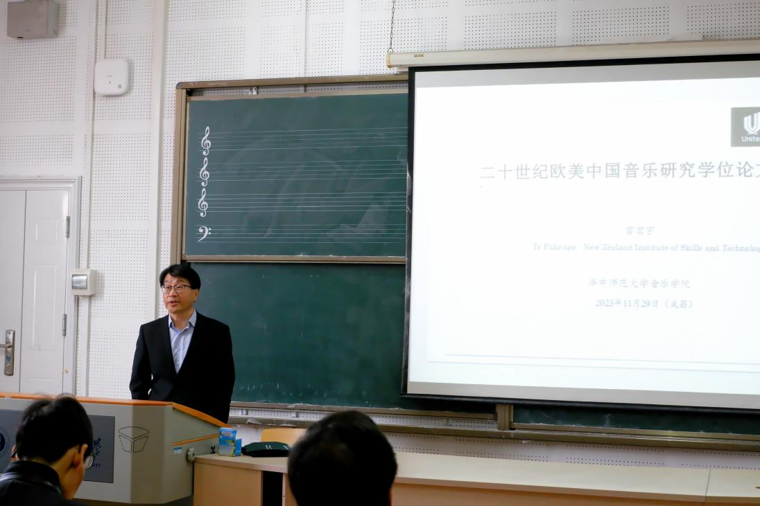 2023年11月29日上午10点,新西兰国立尤尼坦理工学院教授、哲学博士宫宏宇应邀出席华中师范大学音乐学院“海外名师音乐学术系列讲座”,以《二十世纪欧美中国音乐研究学位论文巡礼》为主题进行学术讲座。讲座由我院音乐研究所所长陈永教授、声乐系陈岭教授、音乐学系张文昭老师出席参加,我院部分研究生和本科生到现场聆听学习。