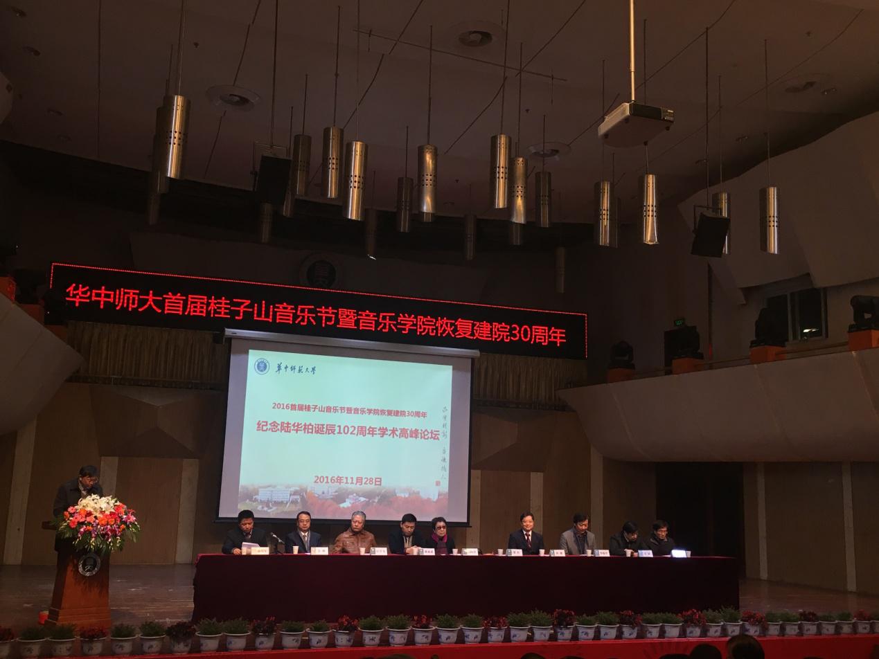 华中师范大学音乐学院恢复建院30周年暨“纪念陆华柏先生诞辰102周年学术高峰论坛”,昨日在我院举行。华中师范大学党委副书记覃红教授、音乐学院孙逊院长致欢迎辞,武汉音乐学院李幼平副院长作为兄弟院校代表致辞,来自全国各地的与会专家及返校校友200多人参加了此次活动。开幕式由康瑞军副院长主持。开幕式上特别感人一幕是,陆华柏先生的夫人、原我院1950年代声乐教师、后担任广西艺术学院院长的甘宗容教授通过视频的方式,向广大来宾和校友问好。甘先生虽已年届92岁高龄,但仍然满怀深情地回顾了她和陆华柏1952-1958年在华师时的美好岁月,她乐观豁达的人生态度与精神,深深地打动了在座的每一个人。随后,我院1986年恢复建系后的首任系主任、著名声乐教育家闫国宜教授,代表恢复建院时的前辈老师们讲话。闫老师历数当时恢复建系时的种种不易,以及老师们齐心协力置办乐器、悉心教学的事迹,并对我院近30年来的发展成绩,给予了肯定。