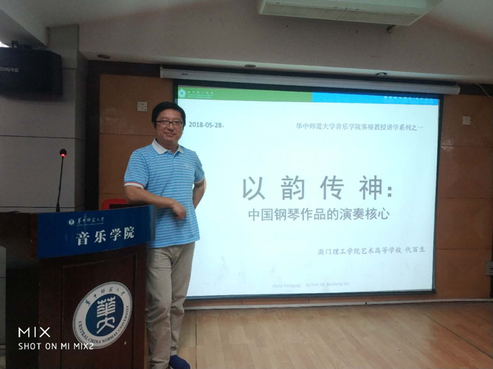 (综述:耿慎蔚) 5月28日上午10:00,我院客座教授——澳门理工学院代百生教授为我院师生带来了题为《以韵传神,中国钢琴作品的演奏核心》的专题讲座。这场讲座是此次代百生教授在我院主讲的为期三天的讲学活动第一场,教室内座无虚席,包括钢琴系、音乐学系的众多师生前来聆听。讲座由我院钢琴系主任凌俐副教授主持。