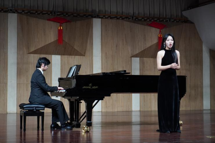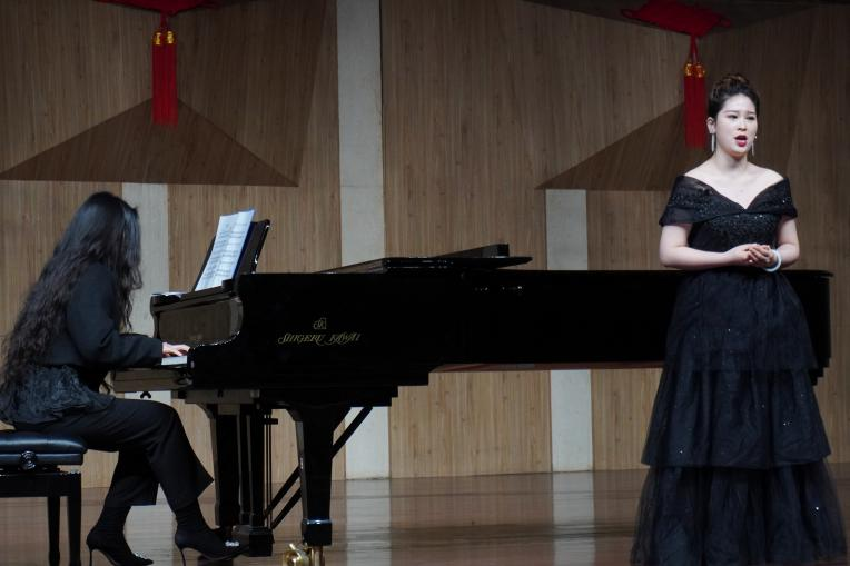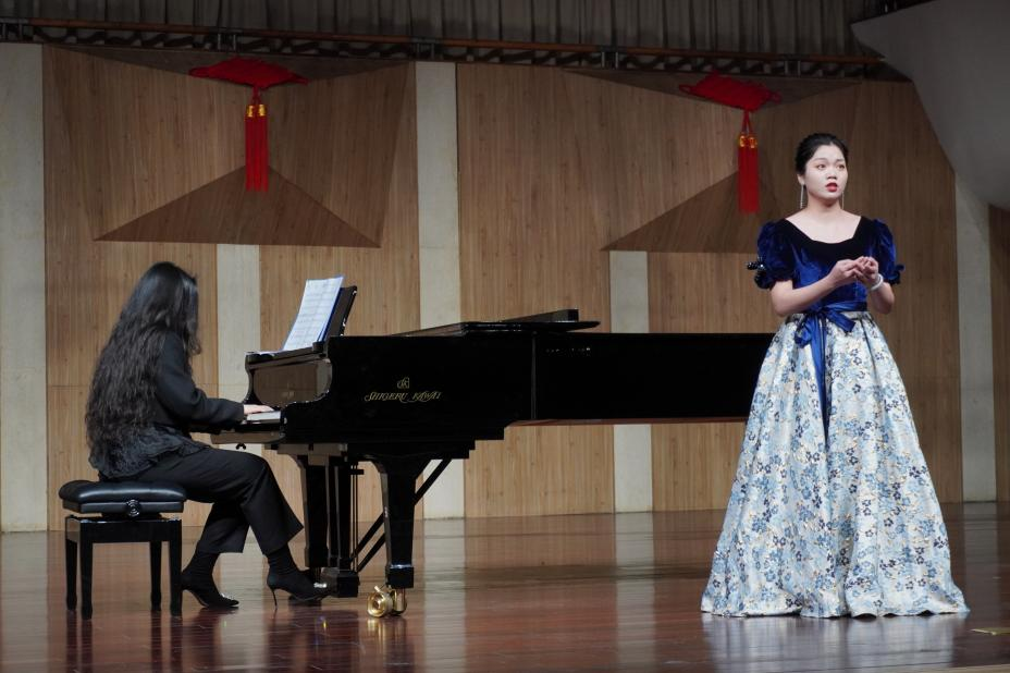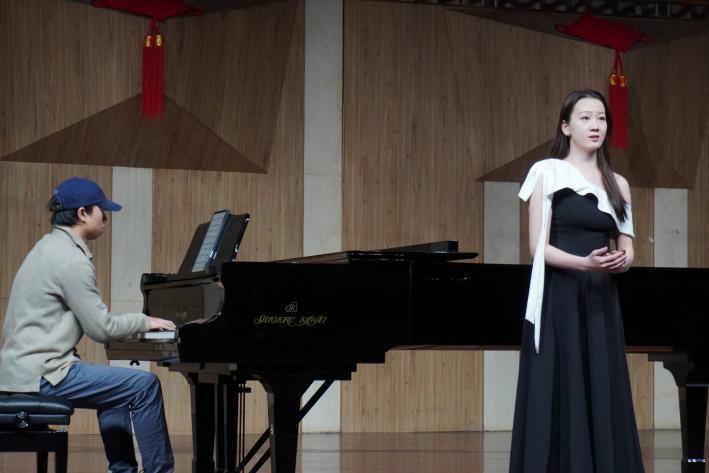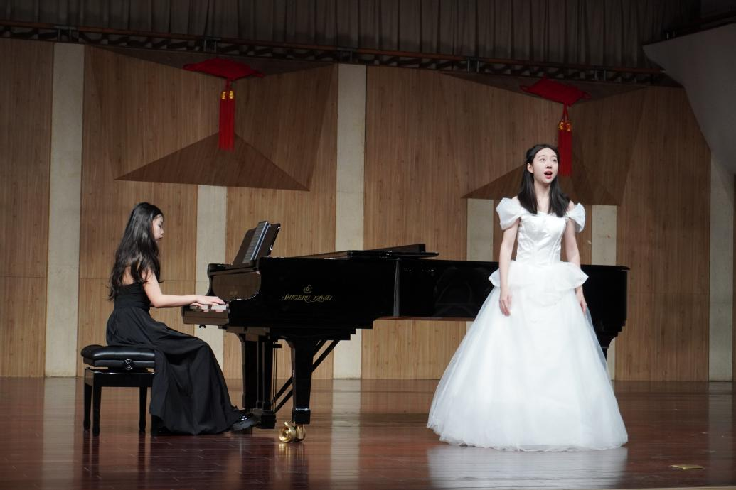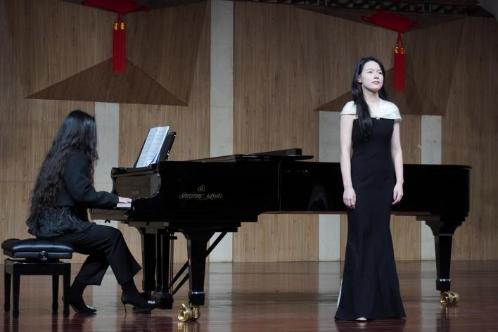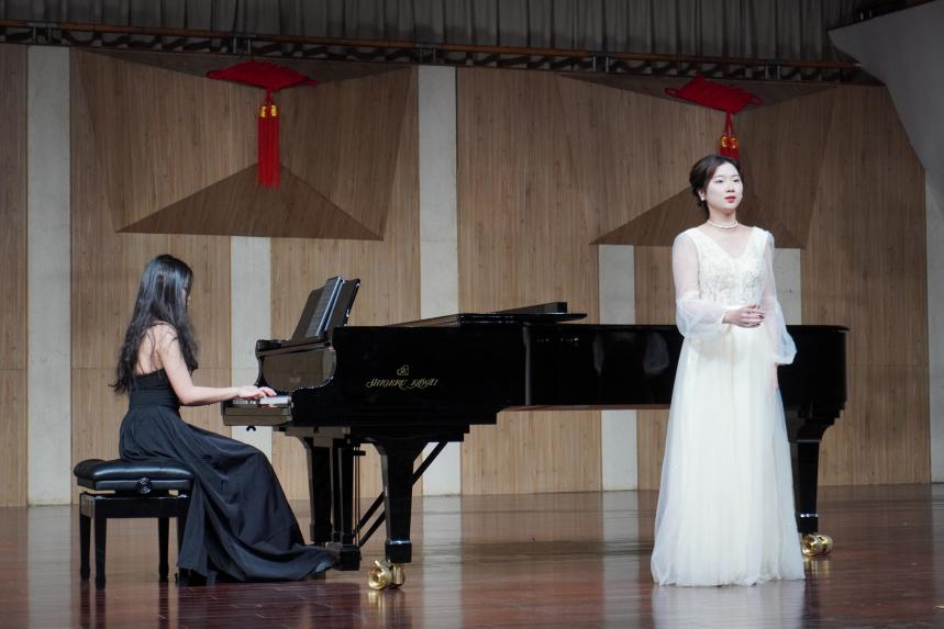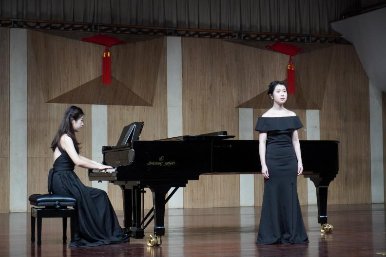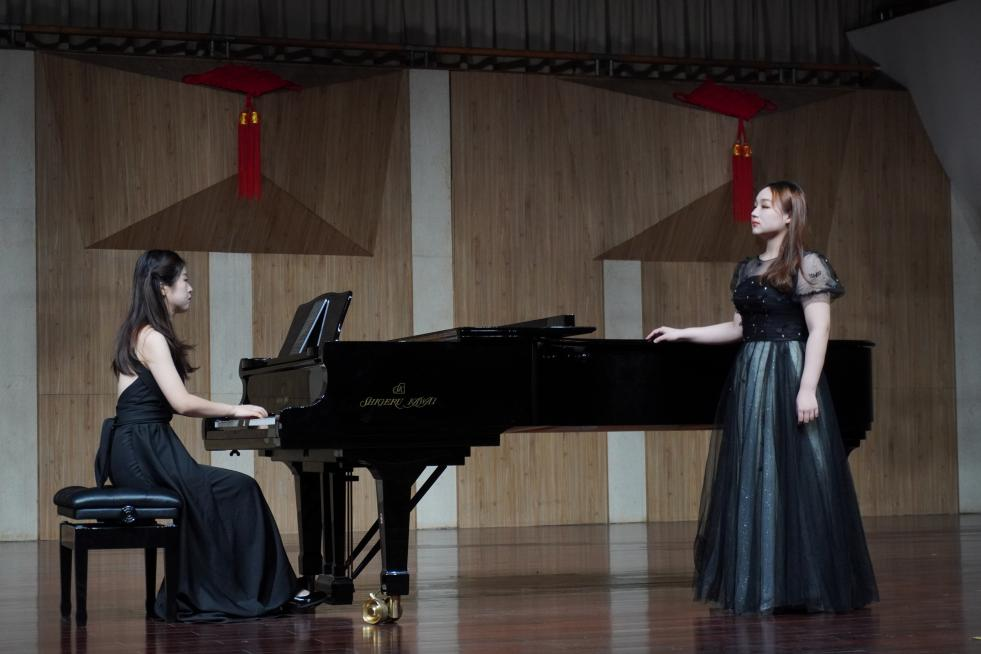 谭冰同学与陈慧敏同学演唱歌曲《母亲教我的歌》,该曲的旋律创作体现了德沃夏克作品中所浸染的深刻捷克民间色彩,配合钢琴流动的旋律融入了淡淡哀愁,曲调朴实无华,展现出了浓浓的思念之情,令同学们更加深入地欣赏到捷克民间音乐的神韵和特点。