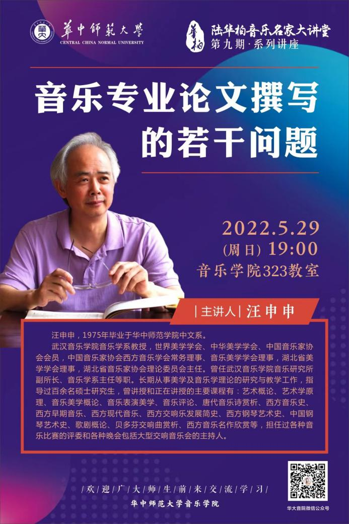 2022年05月29日晚19:00,“陆华柏音乐名家大讲堂”第九期·系列讲座于华中师范大学音乐学院323教室成功开展。担任此次讲座的专家为汪申申教授。