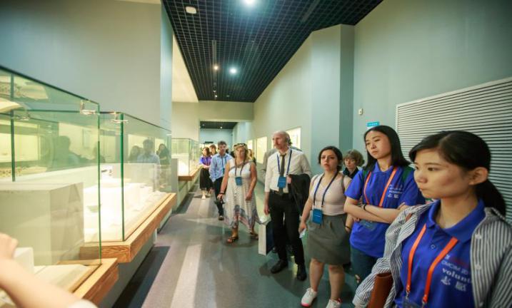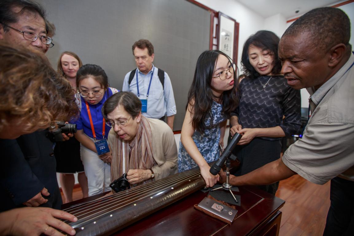 在湖北会场第二天的茶歇时间,湖北省博为各国专家们安排参观刘比建老师的乐器工作坊。杨怡雯同学因为有从小学习古筝的经历被临时安排为各位专家表演。在第一次给外国专家展示中国的传统乐器的这个过程中,音乐作为一种交流的媒介,即使在语言差异影响下,仍能将不同知识背景下的人们连接在一起,这使她体会到了音乐的无国界。