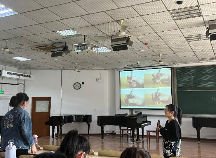 钢笔字二班的课程围绕书写基本常识、汉字笔画、偏旁部首、书写方法等模块展开。培训伊始,黄碧莹通过一系列图片带领同学们领略书法中的形态、气势美,调动同学们对书法的兴趣。黄碧莹也向同学们讲解了科学的书写方法。她强调道,要写好一手好字,首先要临帖。这是学习书法最基本最关键的步骤和方法,贯穿于书法练习的始终。在临帖时,要做到专注,做到形同神似、博采众长,讲究字外功夫,做到融会贯通、自成一家。其次,在书写姿势方面,要头平、身正、臂开、足稳。