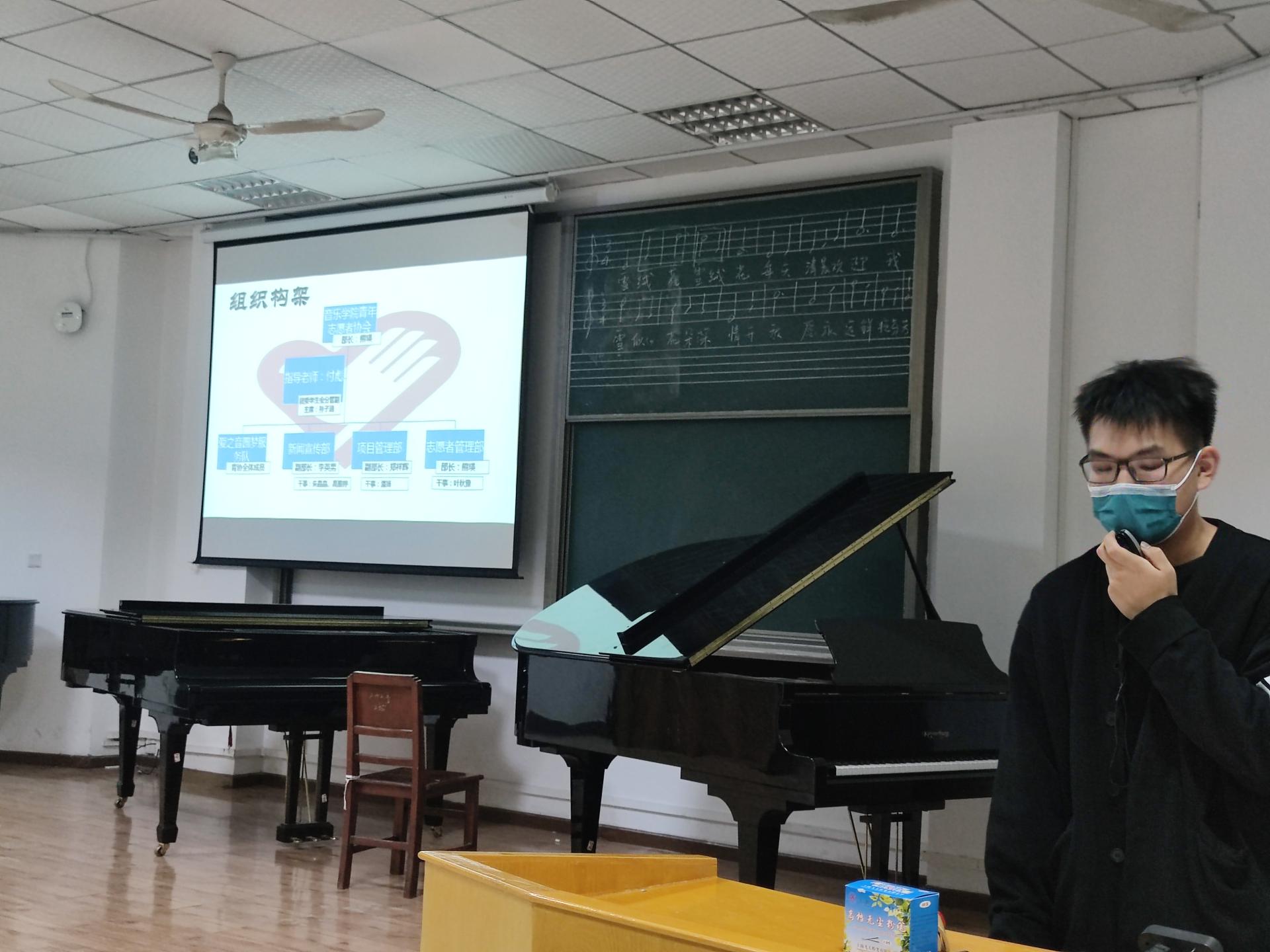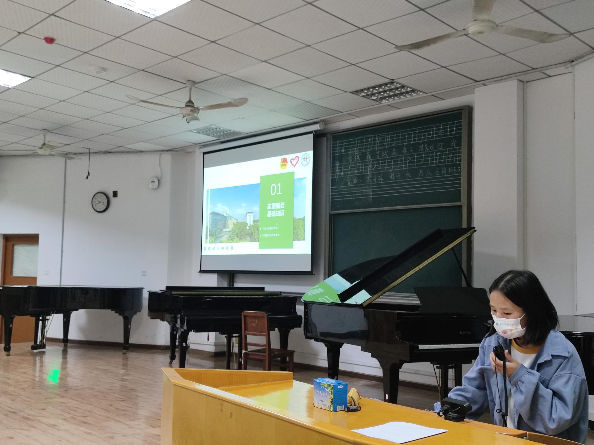 杨丽丽的讲解让同学们对校青年志愿者联合会的基本情况和志愿活动有了基本的了解。音乐学院青年志愿者协会副会长郑祥辉就其所讲内容做总结归纳,并简要向同学们介绍音乐学院“爱之音”圆梦服务队,宣传音乐学院循礼门地铁站、中南路阳光家园线上教学等常规志愿活动和暑期支教、音乐会场务等特色志愿活动。郑祥辉代表音乐学院青年志愿者协会和“爱之音”圆梦服务队向2022级同学发出邀请,希望有更多的新生力量加入到志愿者的行列中来,将音乐与爱带向社会。