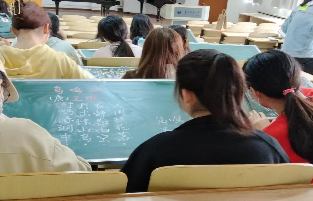 接下来,麻亚宁带领同学们进入“粉笔字书法”实践学习环节,她让同学们运用王维诗人的《鸟鸣涧》在小黑板上做古诗临慕练习。麻亚宁积极与学生们进行互动,为学生们指出优点与不足。同学们积极配合,课堂气氛十分活跃。在麻亚宁的耐心的指导下,同学们逐渐理解本节课教授的书写技巧,并亲身实践,慢慢感受粉笔字书写的独特魅力。