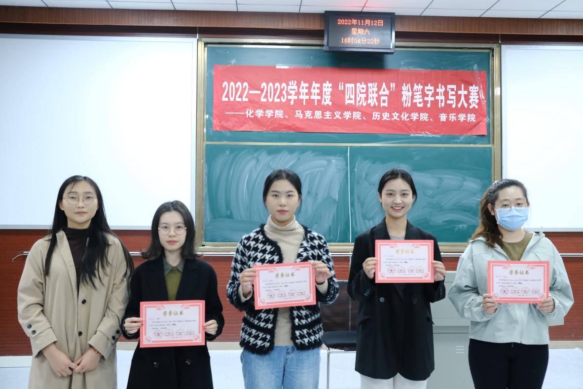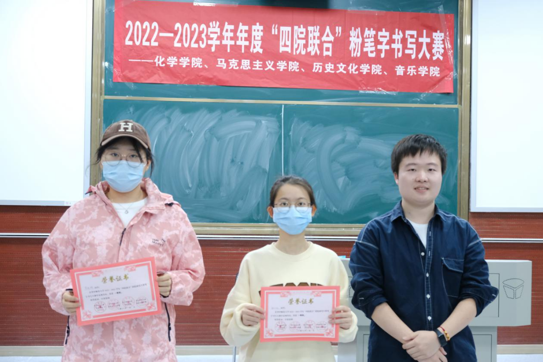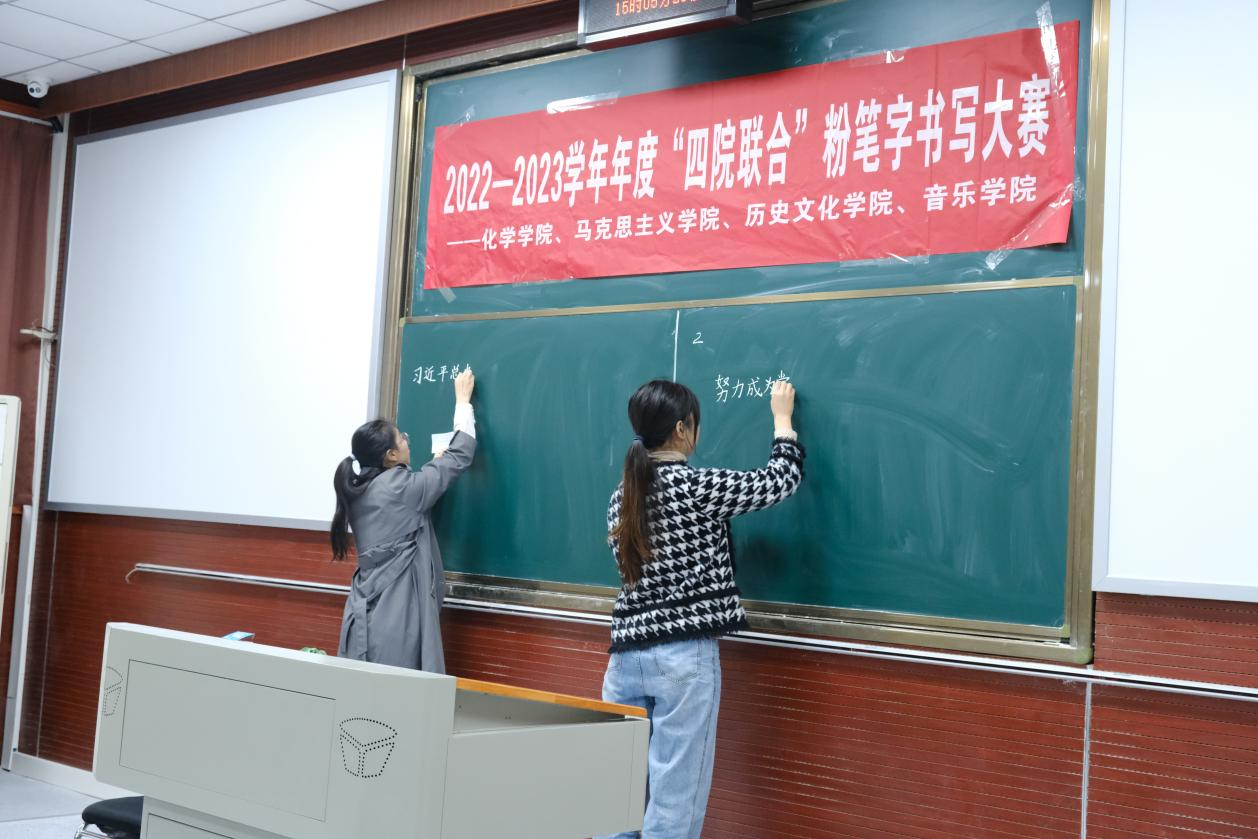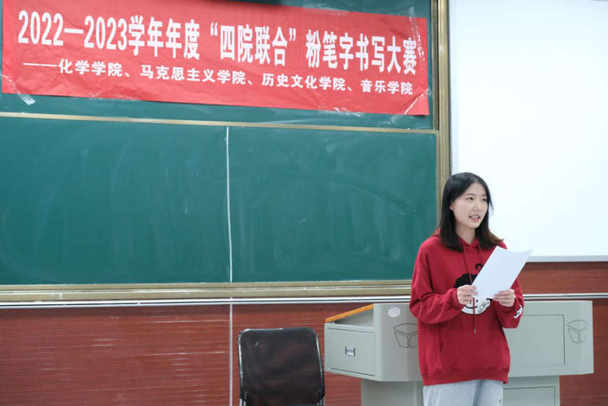 (通讯员 胡佳璇 柯檬 王靓)2022年11月12日下午15:00,由华中师范大学研究生会主办,化学学院研究生会、马克思主义学院研究生会承办,音乐学院研究生会、历史文化学院研究生协办的 2022—2023学年第十四届研究生学术年会之“四院联合”跨院粉笔字书写大赛决赛活动在逸夫化学楼H101教室成功举行。
